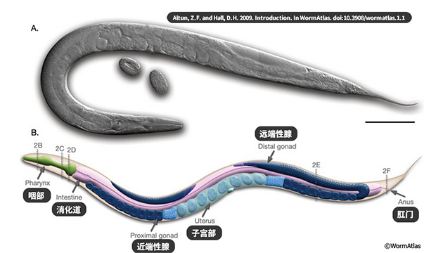 線蟲是一類無體節的無脊椎多細胞生物,絕大多數是線狀的蠕蟲,其中秀麗線蟲在生物研究中起著重要作用,是第一個完成基因測序的動物,約20000個基因中有40%和人類的基因具有同源性,同時秀麗線蟲生命周期短,繁殖量大,還具備完備的發育和解剖學特征、復雜的遺傳學特征,是生物學研究的重要模式動物。