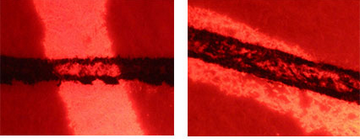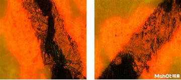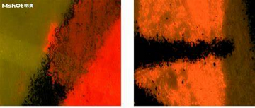 如下圖;左圖為明場透射光的圖片,右圖為熒光圖,對(duì)比左右兩圖可以發(fā)現(xiàn),在交叉部位的非孔漏處有熒光,即為先墨后朱。