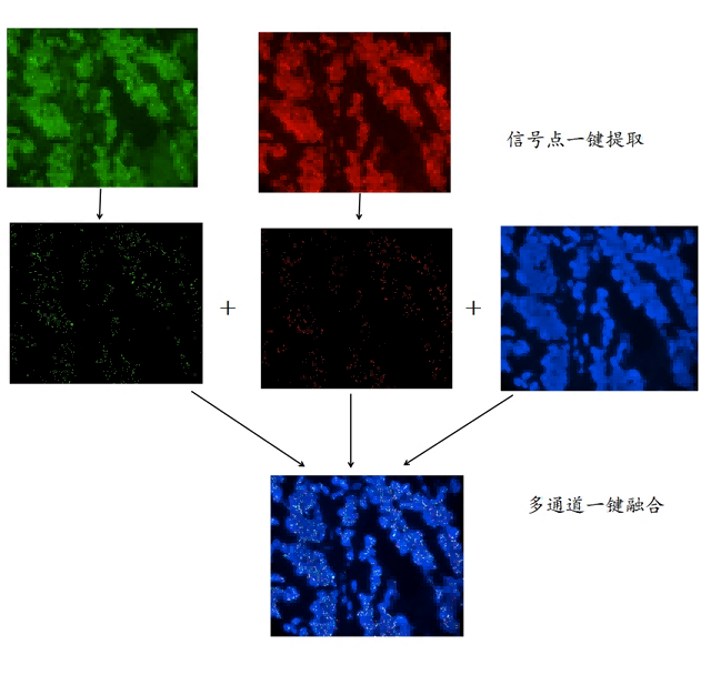 熒光顯微鏡檢做為FISH檢測最后一道關鍵工序,在推進FISH技術的進程中扮演著不可或缺的角色。Mshot明美開發了FISH熒光鏡檢的整套解決方案,這其中包括Mshot明美科研級正置熒光顯微鏡MF43-N以及專用于FISH檢測的醫學影像處理軟件系統Mshot V2.0,醫學影像處理軟件系統配套了2100萬像素科研級制冷高分辨率、高靈敏度、高特異性的熒光攝像頭,軟件具有自動熒光信號點提取、景深擴展、多通道融合及自由報表等功能,打通FISH樣片熒光檢測—圖像處理—出具報告這條完整產線的應用需求。其中強大的自動熒光信號點提取功,可以將提取出的信號點不丟失、亮度不減弱,快速且準確,大大提升了FISH圖像處理效果以及FISH圖像處理效率。以下是FISH熒光信號點一鍵提取功能的效果演示。