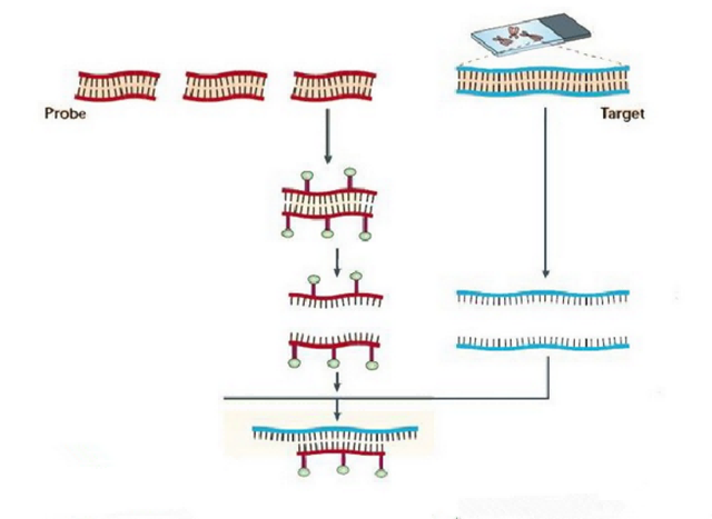 要想使用好這個工具,就不得不說說它的生物學原理。高中生物讓我們學到了生命重要的遺傳物質--DNA(脫氧核糖核酸),它是由特定的堿基序列配對形成的雙螺旋結構,也就是A(腺嘌呤)—T(胸腺嘧啶)配對,G(鳥嘌呤)—C(胞嘧啶)配對。FISH熒光原位雜交技術的核心在于使用熒光標記的DNA探針與待檢測樣品中的目標DNA序列發生特異性的互補配對,在進行FISH熒光原位雜交之前,DNA雙螺旋結構經過處理分解為單鏈的目標DNA,而探針DNA通過人工合成或PCR擴增并在其一端標記上熒光染料,在特定的溫度和鹽濃度下形成探針—目標DNA配對這樣的雙鏈結構,然后對樣品進行洗脫,洗去未結合的探針染料(減少背景雜光干擾),而結合上的熒光染料標記的探針會發出特定顏色的熒光信號