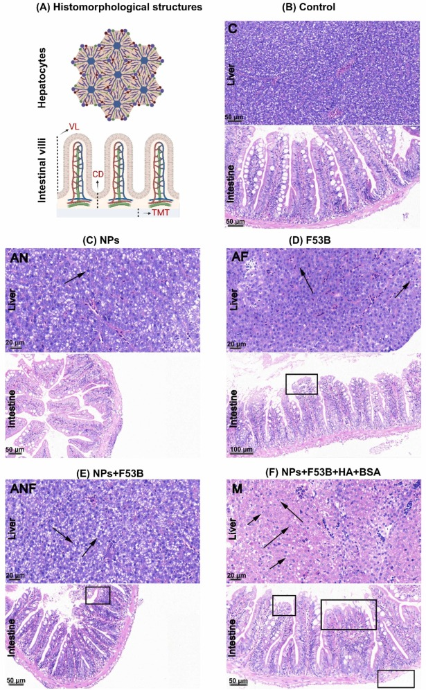 圖1 成年斑馬魚的肝臟和腸道組織于長期暴露于不同處理組21天后的組織病理學變化。(A) 肝細胞和腸絨毛的組織形態結構示意圖;(B)對照組-C;(C) 1?mg/L NPs-AN;(D) 200μg/L F53B-AF;(E) 1?mg/L NPs+?200?μg/L F53B -ANF;(F) 1mg/L NPs + 200μg/L F53B + 10mg/L HA + 10mg/L BSA-M。其中VL為絨毛長度,CD為隱窩深度,TMT為肌層厚度,黑色箭頭表示肝細胞核收縮,黑框表示腸絨毛萎縮。