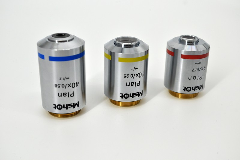 到固定筒長末期和無限遠光學時代,奧林巴斯和尼康終于實現在物鏡層面把橫向色差解決掉,稱為“獨立色差校正”,而蔡司和萊卡則沿用固定筒長時代的策略,將補償橫向色差的任務交給了觀察頭底部的管透鏡和目鏡鏡,需使用跟物鏡配套的觀察頭才能消色差。明美物鏡采用的是獨立消色差設計,更便于實現高質量的顯微相機成像和定制產品開發。