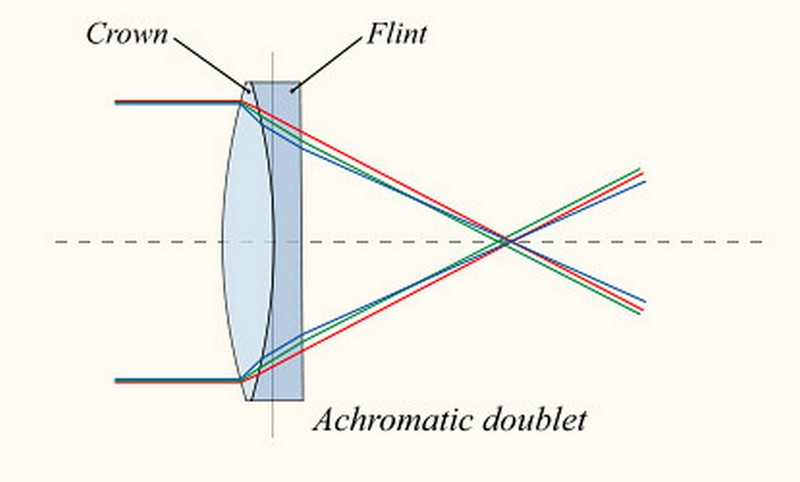 18世紀,光學家John Dollond發明了消色差鏡組,將紅藍兩色聚焦到跟綠色焦面相近的焦面,從而大大減少了軸向色差,提升了清晰度,而且他的設計成本夠低,因此消色差物鏡自此逐漸成為了望遠鏡和顯微鏡的基本配置,直至今天。普通消色差設計,可以校正紅藍兩色色差,以及綠色波段的球差。
