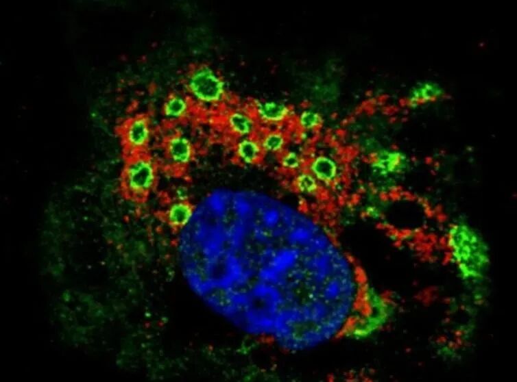 被輪狀病毒(綠)感染的細胞,已經開始空泡化